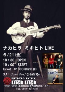 ナカヒラ ミキヒト ■日時■ 2019/6/21 Open 18:30- / Start 19:00- ■料金■ \1,000 ■場所■ 「LUCK LUCK」 島根県大田市大田町大田八67 Tel. 0854837787 Facebook Page