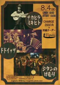 ■出演■ ドドイッツ ジタンのけむり ナカヒラ ミキヒト ■日時■ 2019/8/4 Open 19:00- / Start 19:30- ■料金■ \2,000 ■場所■ 「Traghetto」 東京都杉並区高円寺北3-22-7 プラザ高円寺2F Tel. 0353568862 https://traghetto.jimdo.com/