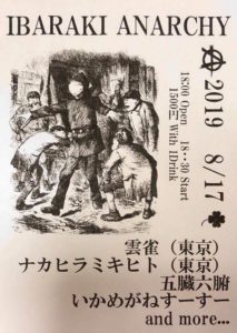 ■出演■ 雲雀 ナカヒラ ミキヒト 五臓六腑 いかめがねすーすー and more… ■日時■ 2019/8/17 Open 18:00- / Start 18:30- ■料金■ \1,500(1D付) ■場所■ 「アナーキー」 大阪府茨木市宮元町1-11 Facebook Page