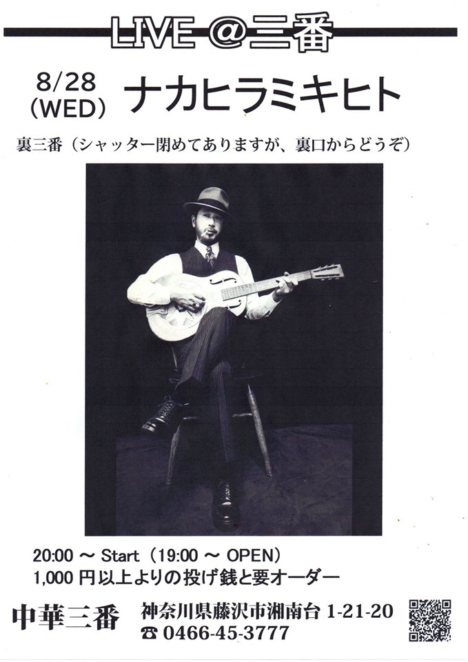 ■出演■ ナカヒラ ミキヒト ■日時■ 2019/8/28 Open 19:00- / Start 20:00- ■料金■ 投げ銭 ■場所■ 「中華三番」 神奈川県藤沢市湘南台1-21-2 Tel. 0466453777 Facebook Page