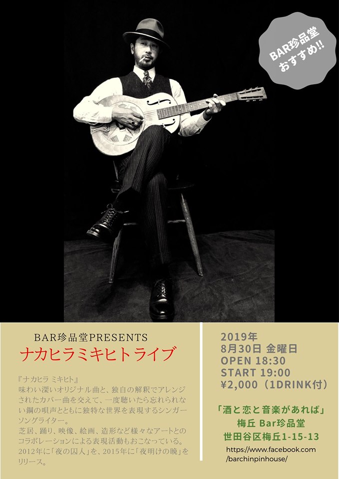 ■出演■ ナカヒラ ミキヒト ■日時■ 2019/8/30 Open 18:30- / Start 19:00- ■料金■ \2,000(1D付き) ■場所■ 「BAR珍品堂」 東京都世田谷区梅丘1-15-13 Tel. 0334200039 https://www.facebook.com/barchinpinhouse/