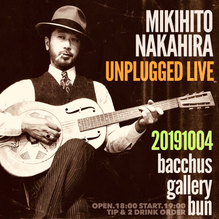 ■出演■ ナカヒラ ミキヒト ■日時■ 2019/10/4 Open 18:00- Start 19:00- (2stage) ■料金■ 投げ銭 + 2D ■場所■ 「Bacchus Gallery Bun」 東京都渋谷区恵比寿西2-20-14 森川コロニー402 Tel. 09099627183 http://bungomorita.jp/bun/