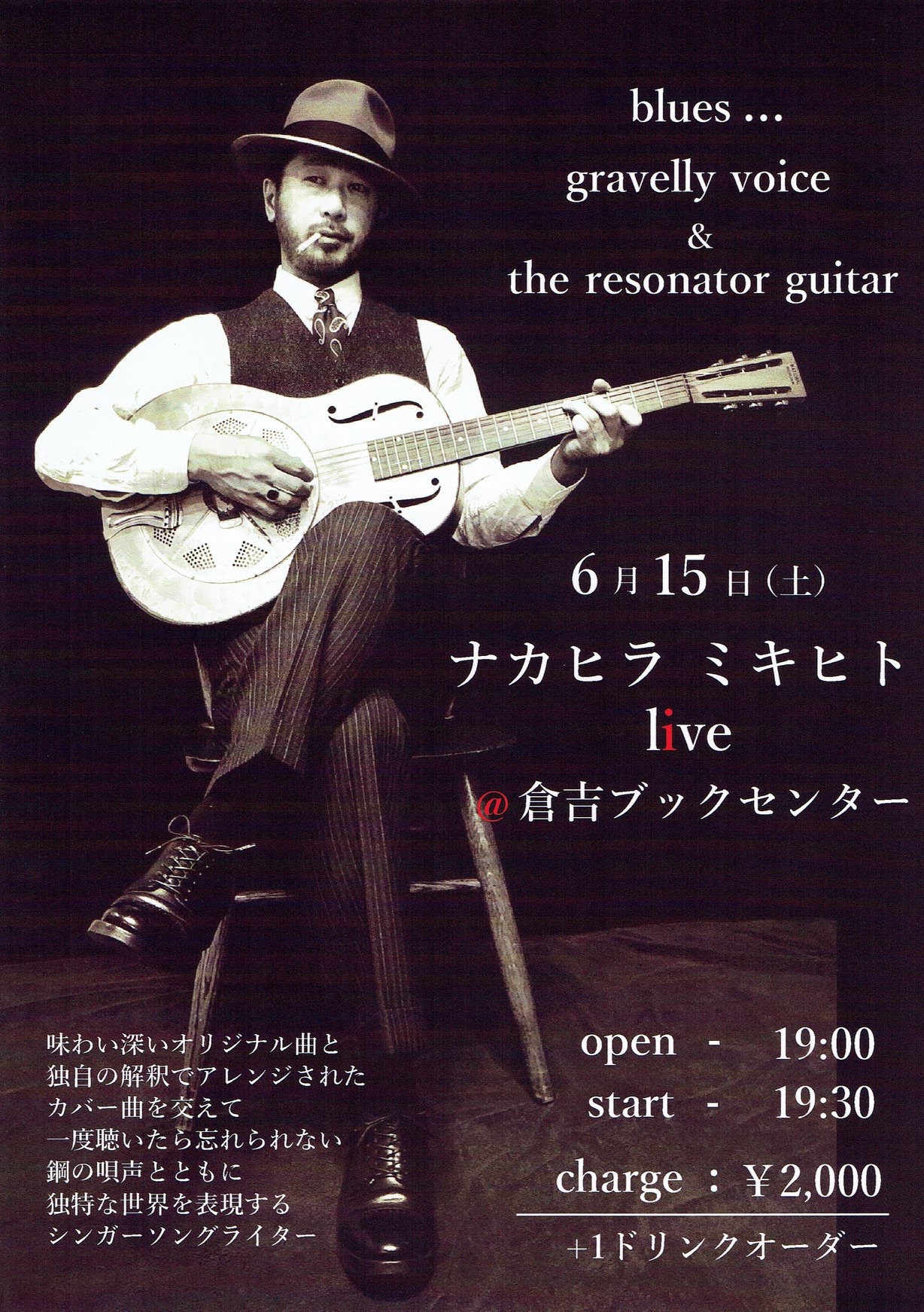 ■出演■ ナカヒラ ミキヒト ■日時■ 2019/6/15 Open 19:00- / Start 19:30- ■料金■ \2,000 + 1D ■場所■ 「倉吉ブックセンター」 鳥取県倉吉市東岩倉町2252 Tel. 0858240375 https://www.facebook.com/kurayoshibookcentre/