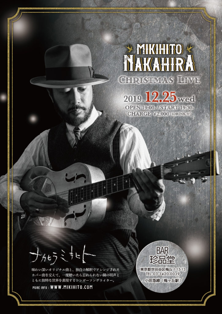 ■出演■ ナカヒラ ミキヒト ■日時■ 2019/12/25 Open 19:00- / Start 19:30- ■料金■ \2,000(1D付き) ■場所■ 「BAR 珍品堂」 東京都世田谷区梅丘1-15-13 Tel. 0334200039 https://www.facebook.com/barchinpinhouse/