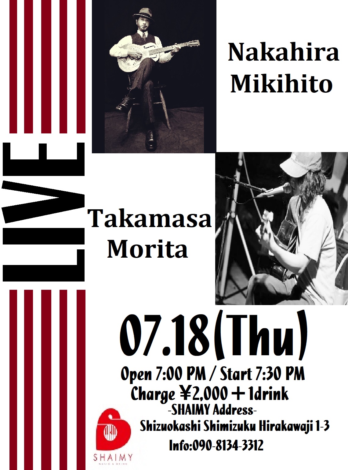 ■出演■ 森田 崇允 ナカヒラ ミキヒト ■日時■ 2019/7/18 Open 19:00- / Start 19:30- ■料金■ \2,000 +1D ■場所■ 「SHAIMY」 静岡県静岡市清水区平川地1-3 Tel.09081343312