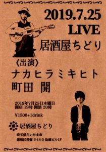 ■出演■ 町田 開 ナカヒラ ミキヒト ■日時■ 2019/7/25 Open 19:00- / Start 20:00- ■料金■ \1,500 +1D ■場所■ 「居酒屋ちどり」 埼玉県さいたま市浦和区常盤3-14-3 鳥越ビル1F Tel.09075298390 http://chidori.wpblog.jp/