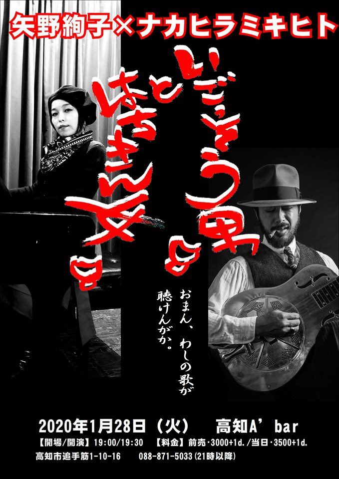 ■出演■ 矢野 絢子 ナカヒラ ミキヒト ■日時■ 2020/1/28 Open 19:00- / Start 19:30- ■料金■ 前売\3,000+1d / 当日\3,500+1d ■場所■ 「A’bar」 高知県高知市追手筋1-10-16 Tel. 0888715033 Facebook Page