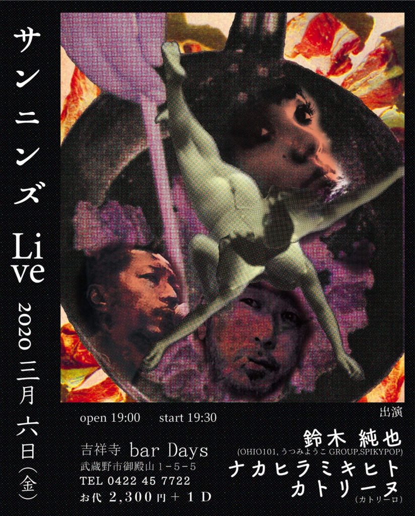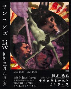 ■出演■ 鈴木 純也 カトリーヌ ナカヒラ ミキヒト ■日時■ 2020/3/6 Open 19:00- / Start 19:30- ■料金■ \2,300 +1d ■場所■ 「Bar Days」 東京都武蔵野市御殿山1-5-5 Tel.0422457722 https://retty.me/area/PRE13/ARE663/SUB1202/100000138832/