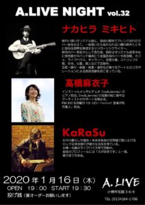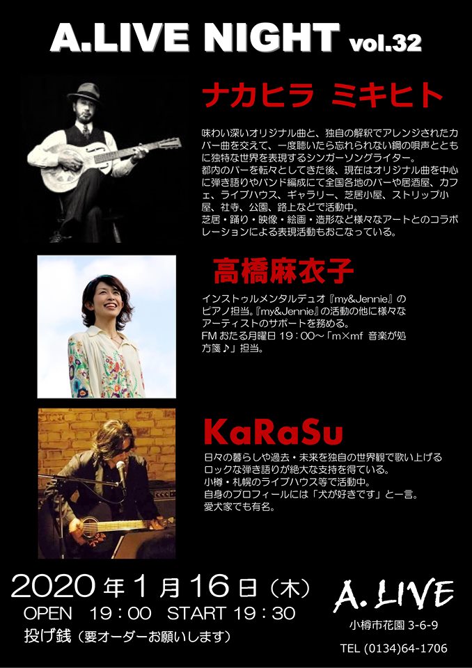 ■出演■ ナカヒラ ミキヒト 高橋 麻衣子 KaRaSu ■日時■ 2020/1/16 Open 19:00- / Start 19:30- ■料金■ 投げ銭 ■場所■ 「A.LIVE」 北海道小樽市花園3丁目6-9 Tel.0134641706 https://www.facebook.com/ALIVE-1683645215252199/